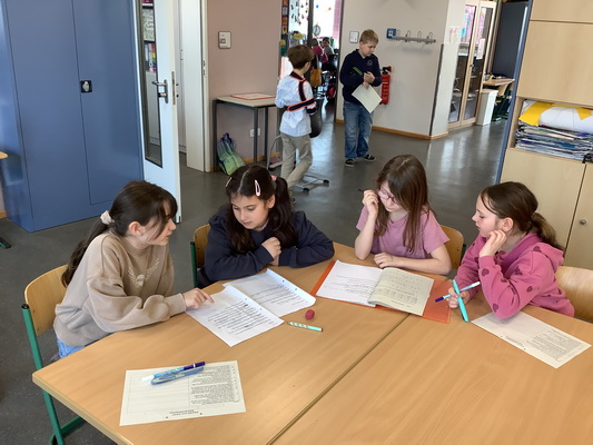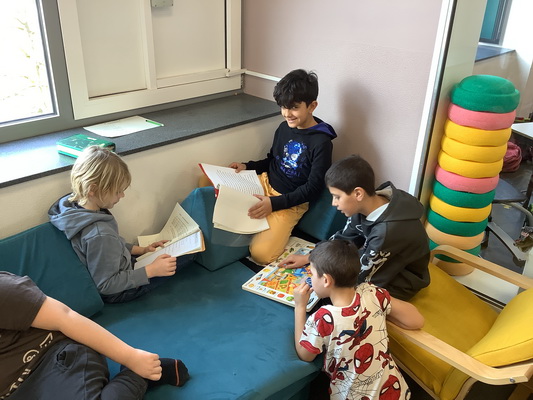 Später hat uns Jana aus der Bärenklasse die Geschichte der Silbenkönige vorgelesen. Darin reist ein kleiner Astronaut von einem Planeten zum nächsten, aber auf jedem Planet gibt es nur einen Silbenkönig und alle sprechen ganz komisch. Sie sagen Giten Tig, Gutun Tug, Gatan Tag, Geten Teg…