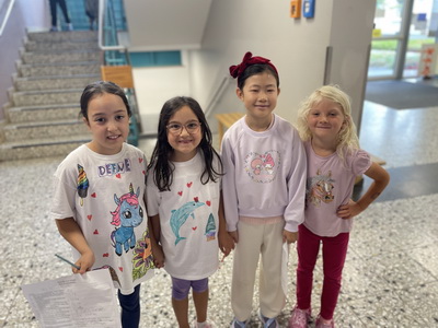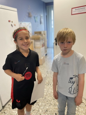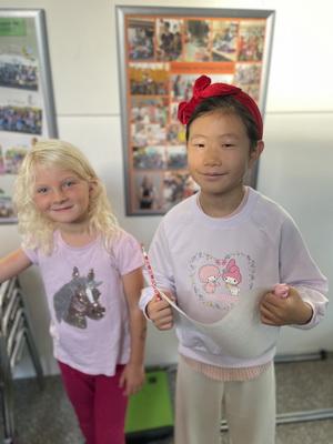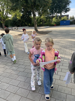 Am 4. Schultag haben wir unsere Patenkinder aus der Mäuseklasse kennengelernt. Sie haben uns in unserer Klasse besucht und uns abgeholt. Das war schon sehr aufregend. Wir sind zusammen durch die Schule gelaufen und haben das Sekretariat, den Hausmeister, den Kakao und viele andere Orte gesucht.