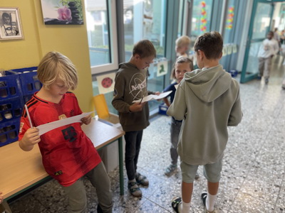 Bei einer Schulrallye sind wir gemeinsam durch die Schule gelaufen und haben gemeinsam Fragen beantwortet. Wir mussten herausfinden, wo Frau Sloma sitzt, welche Klassen es auf der ersten Etage gibt und sogar die Anzahl der Jungentoiletten. Alle Fragen haben wir natürlich mit unserem Patenkind beantwortet. Nach der Rally durften wir noch gemeinsam spielen, damit wir uns besser kennenlernen.