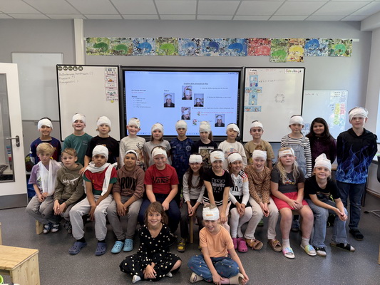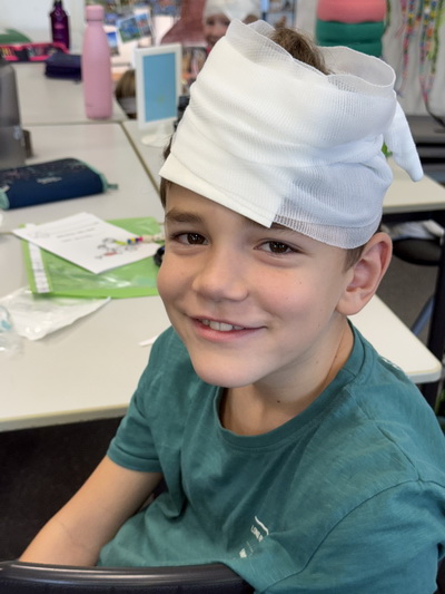 Im Sachunterricht haben wir uns mit dem Thema „Erste Hilfe“ beschäftigt. Wir haben gelernt, wie wir einen Fingerverband anlegen und auch, wie wir einen Kopfverband richtig wickeln können. Wir sahen richtig lustig aus. Natürlich durfte auch die stabile Seitenlage nicht fehlen, die wir nun richtig gut können.