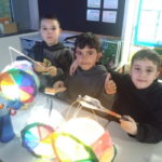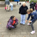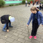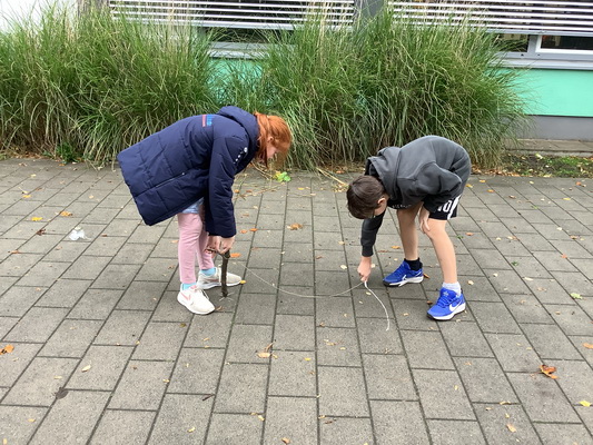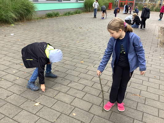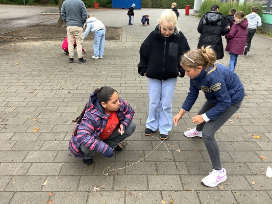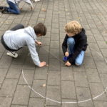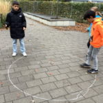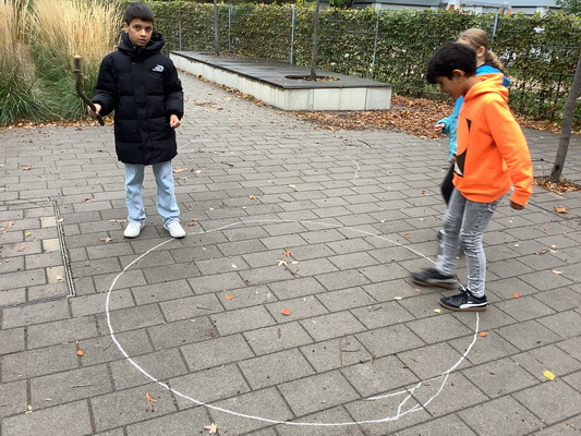 Vor den Herbstferien waren wir mit der Klasse auf dem Schulhof und haben mit Kreide Kreise gemalt. Die Kreide wurde mit der Schnur verknoten, in der Mitte stand der Stock und das war der Mittelpunkt. Die Kreise waren unterschiedlich groß. Am Ende haben wir uns alle Kreise angesehen und waren zufrieden.