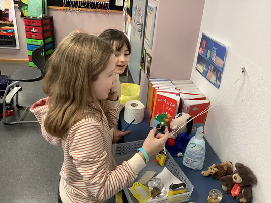 Herr Barth hat uns heute den Anfang von “Ein Haufen Freund hält zusammen” vorgelesen. Danach haben wir endlich mal wieder unsere Tiere als Fingerpuppen bekommen. Wir sollten uns dann das Ende des Buches überlegen und das in einem richtigen Fingerpuppentheater vorspielen. Wir haben toll geübt und uns dann alle ins Theater gestellt. Wir waren aufgeregt, aber jeder hat sich getraut und es wurden tolle Theaterstücke! Am Ende haben wir dann noch das wahre Ende des Buches gelesen. Es war eine richtig schöne Stunde.