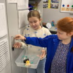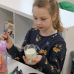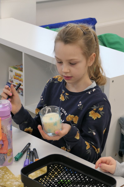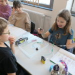 Wir haben Blätter, Schrauben, Papier, Münzen, Bälle oder Schiffe untersucht. Außerdem konnten wir noch Dinge von uns selbst austesten. Am Ende haben wir in einem Gemeinschaftsexperiment eine Kartoffel durch Salzwasser zum Schwimmen gebracht. So haben wir auch ein wenig gelernt, warum Schiffe schwimmen können. Es waren tolle Experimente und die Tische blieben sogar trocken.