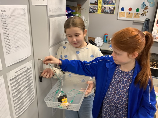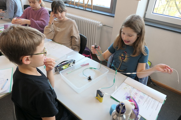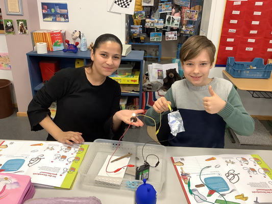 Wir haben Glühlampen, LEDs und Krokodilklemmen verwendet. Wir haben damit verschiedene Stromkreise hergestellt. Wir haben uns auch eigene Schalter gebastelt. Außerdem haben wir geschaut, welche Materialien Strom leiten. Es hat Spaß gemacht. Immer, als die Lampe leuchtete, leuchtete auch unsere Note und unser Kopf.