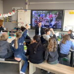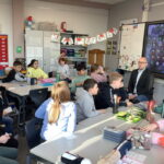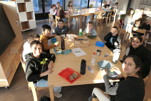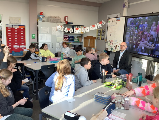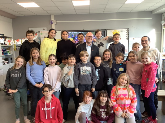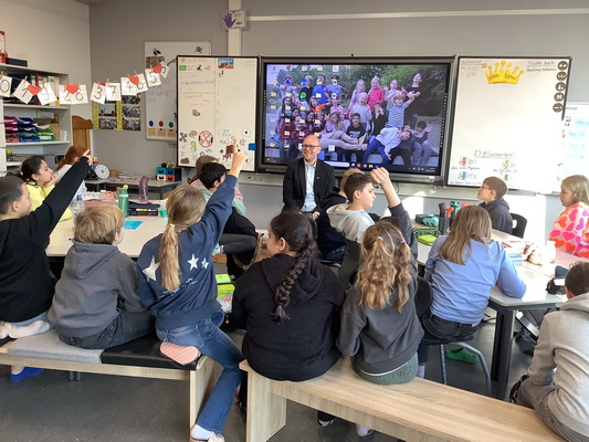In der Frühstückspause kam der Bürgermeister Simon Panke zu uns. Wir waren sehr aufgeregt. Dann durften wir ihm viele Fragen stellen, z.B. über seinen Beruf. Es war sehr interessant. Wir haben auch ein Foto gemacht und fanden den Bürgermeister richtig nett. Schön, dass er da war!