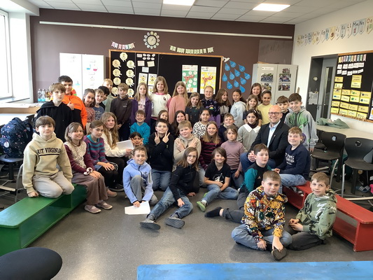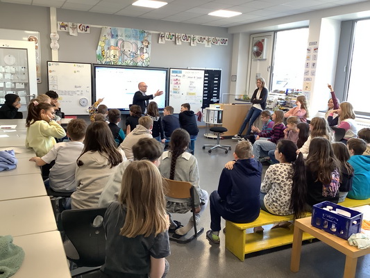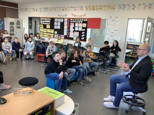 Ende Januar war unser neuer Bürgermeister Simon Panke zu Besuch in der Maulwurf- und Bienenklasse. Wir durften ihm alle möglichen Fragen zu seinem Job stellen, aber auch persönliche Anliegen und Wünsche äußern. Er hat sich alles interessiert angehört und auch Nachfragen zu unseren Sorgen gestellt und überlegt, welche Möglichkeiten er hat, um uns zu helfen. Besonders interessiert hat uns das geplante Neubaugebiet an der Trabrennbahn.