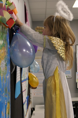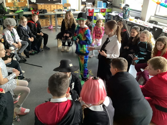 Am 13. Februar war es wieder soweit: Statt der vielen Schüler und Lehrer wurde die Averbruchschule von lauter unterschiedlichen Gestalten aufgesucht. Es kamen Dinosaurier, Rehe, Engel, Krümmelmonster, Clowns, Harry Potter, Engel, Süßigkeiten und allerlei andere seltsame Wesen. Sie brachten Entschuldigungsbriefe mit, die erklärten, weshalb die Schüler und Lehrer nicht zum Unterricht kommen konnten und einen Vertreter geschickt haben: Sie sind spontan in den Urlaub gefahren, auf ein Konzert gegangen, haben ein Kind bekommen oder sind an einem gefährlichen Virus erkannt.